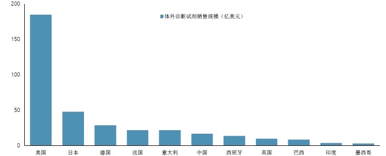 美国是最大的IVD市场占据全球47%的市场份额。欧洲占据了31%的IVD市场份额,其中德国占据欧洲市场的23.24%,法国占据欧洲市场的16.89%,意大利欧洲市场的16.41%。在亚洲,日本是最大的诊断试剂市场。诊断试剂的市场规模与医疗水平的发展状态具有相关性。