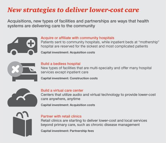 2. “无病床”医院。一些医疗系统正通过“无病床”医院来降低住院护理成本。无病床医院配备有急诊室、观察室、手术室和特色专科门诊,如心脏病学,神经病学和肿瘤学等,但不设住院部。这不仅避免了住院治疗的高额固定成本,也减少了患者就医时间,提高了整体体验。有了这样的新型医疗设施,许多患者再也不需要费尽周章地去到医疗中心本部看病了。无病床医院仍然是一种新生事物,Montefiore医疗中心在2014年开设了第一家此类医院,另有三家医疗系统预计于2016年及以后开设类似设施。