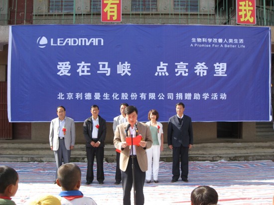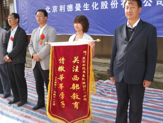 马峡,甘肃—— 2010年9月7日,北京星空平台-星空(中国)一站式服务平台生化股份有限公司向甘肃省平凉市华亭县马峡中心小学无偿捐赠了价值十万元的钢木课桌椅。北京星空平台-星空(中国)一站式服务平台生化股份有限公司副总经理张雅丽、华亭县县委常委、副县长徐德才、华亭县教育局局长陶玉宏等出席了捐赠仪式。马峡中心小学校长杜安平向星空平台-星空(中国)一站式服务平台公司赠送了锦旗,表达感激之情。