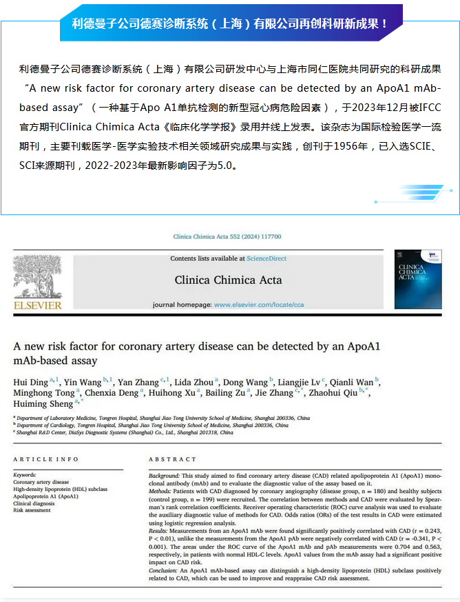 科研创新 │ 星空平台-星空(中国)一站式服务平台子公司德赛诊断系统(上海)有限公司联合上海市同仁医院再创科研新成果