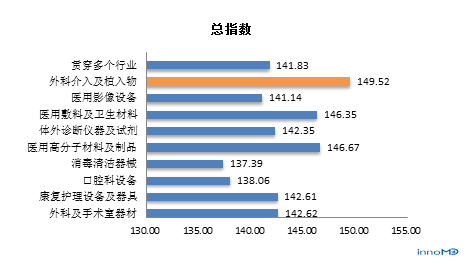 数据显示,所处不同子行业受访者对中国医疗器械总信心指数均较高,而外科介入及植入物行业的受访者总信心指数最高,是149.52。其次为医用高分子材料及制品行业的受访者为146.67;第三为及卫生材料行业的受访者,为146.35.
