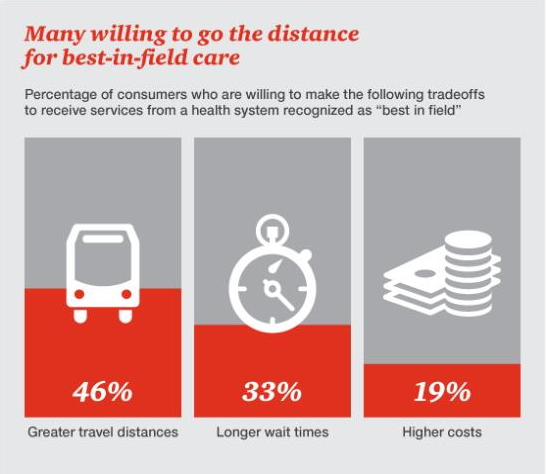 顺应从治疗个别患者到人口健康管理的趋势,医疗服务方亦将重点放在了增强其品牌效应上。在并购浪潮中,品牌可能是吸引消费者的关键所在。HRI调查结果显示,86%的消费者表示在选择医疗系统时,其品牌是否有“某领域最佳”的认可非常重要。为了获取“某领域最佳”的医疗服务,46%的受访者愿意跑去更远的地方;33%的受访者愿意等待更长的时间;19%的受访者愿意付出更多的金钱。医疗服务方应明智地选择适合自己的发展策略,例如像梅奥诊所护理网络那样与顶级的医疗系统合作。该网络已与全美20个州的当地医院签订了合作协议,而这种合作方式可以作为传统收购形式的一种替代。