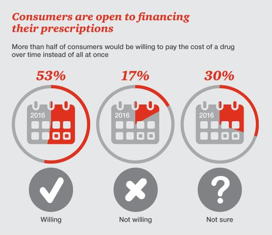 而消费者夹在中间,常常会感觉买药艰难。根据2015年HRI的消费者调查报告《钱钱钱》,17%的美国成年人会请求其医生开具更便宜的处方。由于在新医疗经济中高免赔额医疗保险计划无处不在,消费者对于药品价格的无可奈何可能还会增加。另一方面,超过半数(53%)的消费者更倾向于分期购买药品,而不是一次性付清(17%)。