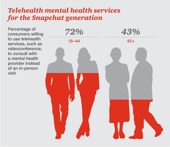 互联网医疗初创公司自然也不甘落后。如Lyra Health和Doctor on Demand等正在推动个人领域中的变革,让消费者只需在智能手机上轻松操作,便可以连接至临床心理医师。同时,通过生物识别标志诊断精神疾病的技术,如南加州大学开发的虚拟检查官“艾莉”等,也正渐渐成为现实。诸如此类的数码医疗产品可能更适合对新鲜事物充满好奇的年轻人。根据HRI的调查结果,美国18-44岁人群中的72%愿意尝试远程心理医疗服务;而在45岁以上人群中,这一比例仅为43%。