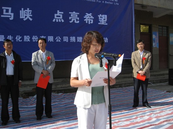 马峡,甘肃—— 2010年9月7日,北京星空平台-星空(中国)一站式服务平台生化股份有限公司向甘肃省平凉市华亭县马峡中心小学无偿捐赠了价值十万元的钢木课桌椅。北京星空平台-星空(中国)一站式服务平台生化股份有限公司副总经理张雅丽、华亭县县委常委、副县长徐德才、华亭县教育局局长陶玉宏等出席了捐赠仪式。马峡中心小学校长杜安平向星空平台-星空(中国)一站式服务平台公司赠送了锦旗,表达感激之情。
